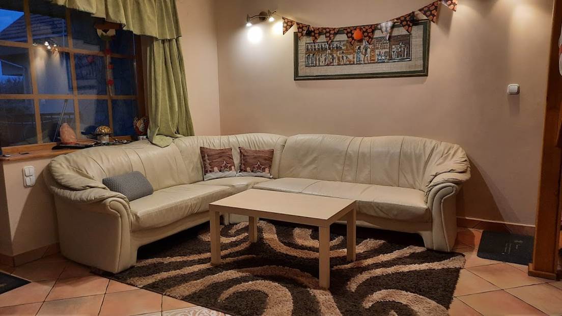 Téli napokon a kandalló melege mellett pihenhetnek vendégeink. A tágas nappali egy légtérben van az étkezővel és a konyhával.